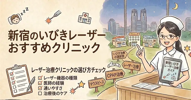 この記事では、新宿でいびきレーザー治療が受けられるクリニック5院を、治療法の種類・料金・診療時間・特徴とあわせて詳しくご紹介します。