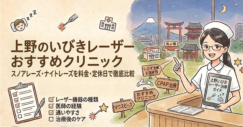 この記事では、上野・湯島エリアでいびきレーザー治療が受けられる3院を、治療法の特徴・料金・診療時間・定休日の違いとあわせて詳しくご紹介します。「自分に合うクリニックはどこか」を判断できる情報を比較しやすい形でまとめました。