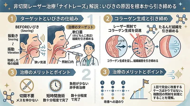 ここでは、ナイトレーズの治療内容や、いびきが改善する仕組みについて整理します。