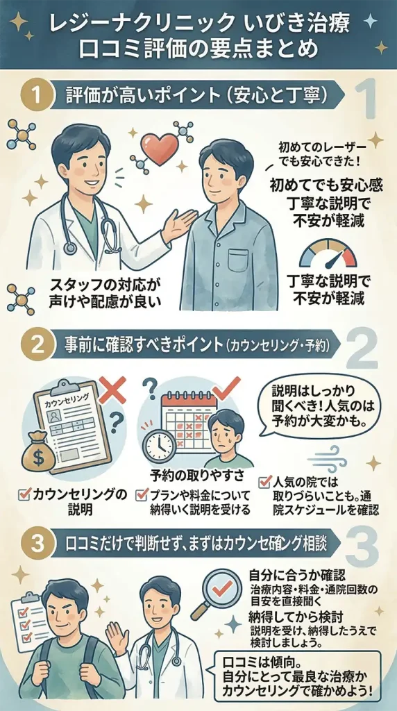 こうした口コミを総合すると、レジーナクリニックのいびき治療は「対応の丁寧さを評価する声がある一方、カウンセリングや予約については事前に確認しておくことが大切」という傾向が見えてきます。